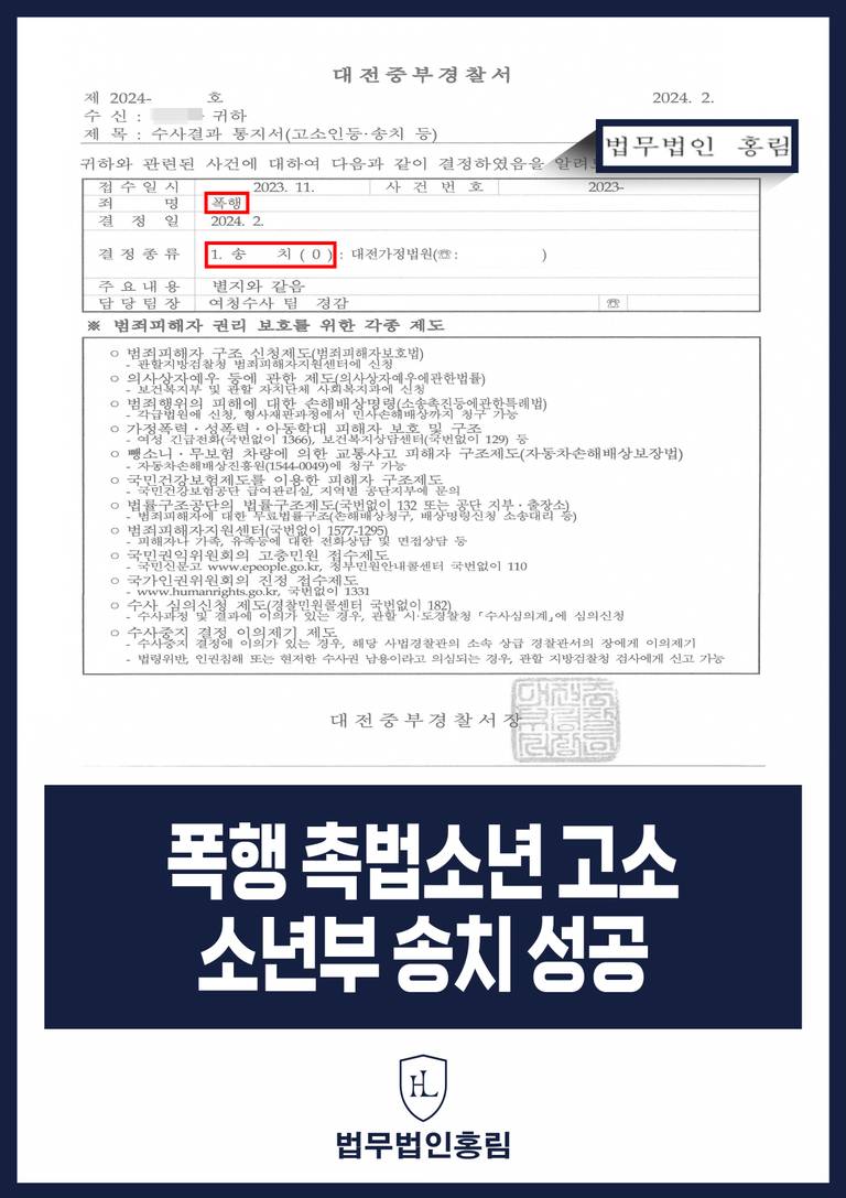 결국 경찰은 가해 학생에 대하여 소년부로 송치한다는 최종 결정을 내렸으며 이는 실무적인 폭행 촉법소년 고소 성공 결과로 이어졌습니다.