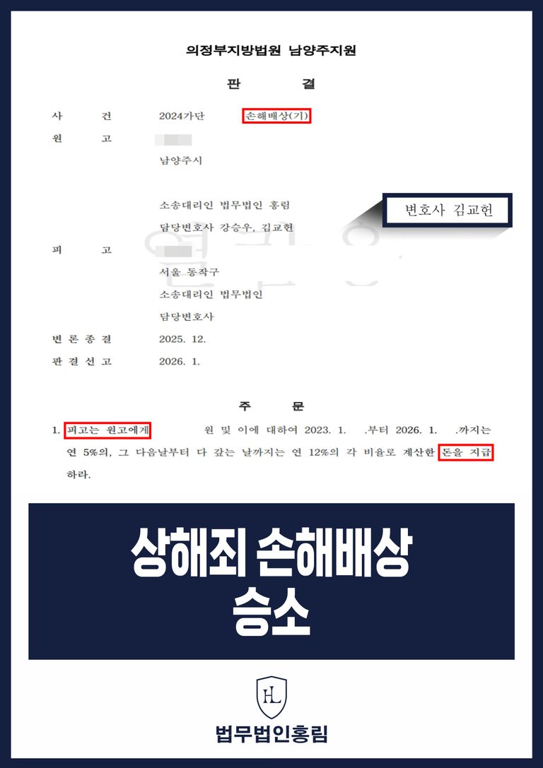결국 법원은 가해자에게 의뢰인이 입은 유무형의 손해에 대해 배상금을 지급하라는 원고 승소 판결을 내렸습니다. 가해자는 형사 처벌이라는 전과를 남김과 동시에 경제적으로도 막대한 배상 책임을 지게 되었습니다.