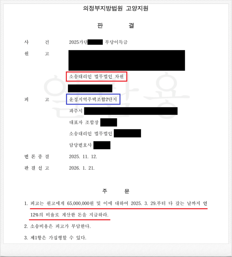 그러나, 가입 후 피고 운정지역주택조합2단지가 진행하는 사업이 계획대로 진행되지 않았고, 이에 의뢰인께서는 정식 민사소송을 통하여 기 납입한 계약금을 반환받기를 원하셨습니다.