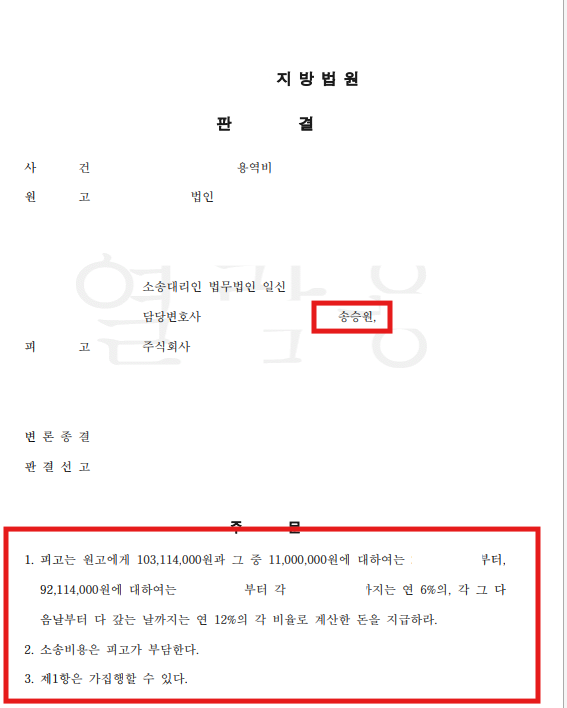 재판부는 송승원 변호사의 주장을 전부 수용하며 전부 승소 판결을 이뤄냈습니다. 끝까지 집요하게 싸우겠습니다.