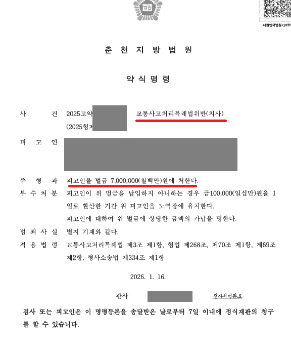 그 결과, 본 사건은 벌금 700만 원의 구약식으로 검찰 처분이 이루어졌고, 법원 역시 동액의 약식명령을 그대로 발령함으로써 정식 재판 없이 사건이 조기에 종결되었습니다. 교통사고 사망 사건이라는 점을 고려하면, 이는 피의자 입장에서 매우 이례적이고 의미 있는 결과라고 평가할 수 있습니다.