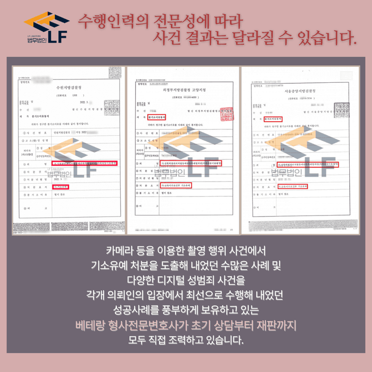 위와 같은 부분을 중점으로 피의자 입장에서 카메라등이용촬영죄 사건에 효과적으로 대응할 수 있는 능력은 각 변호인마다 상이할 수 있습니다.