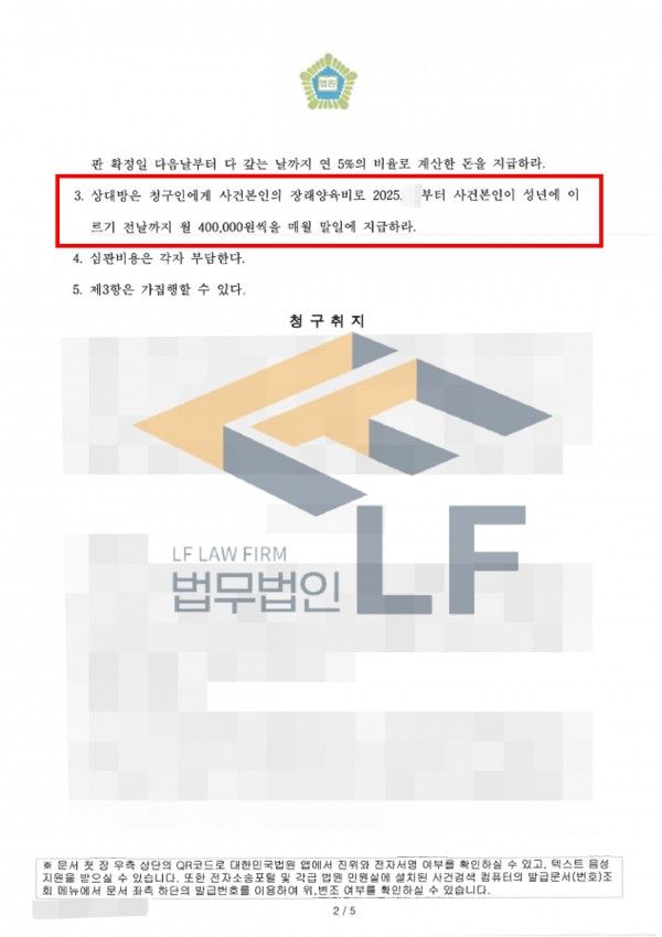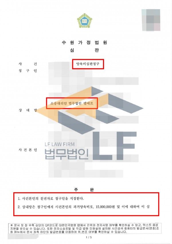 법원에서는 본 변호인이 작성한 의뢰인의 청구 취지와 제출 자료를 바탕으로, 상대방이 의뢰인에게 과거 양육비 15,000,000원을 지급할 것과, 장래 양육비로 매달400,000원을 의뢰인에게 지급할 것을 명령하는 결정을 내렸습니다.