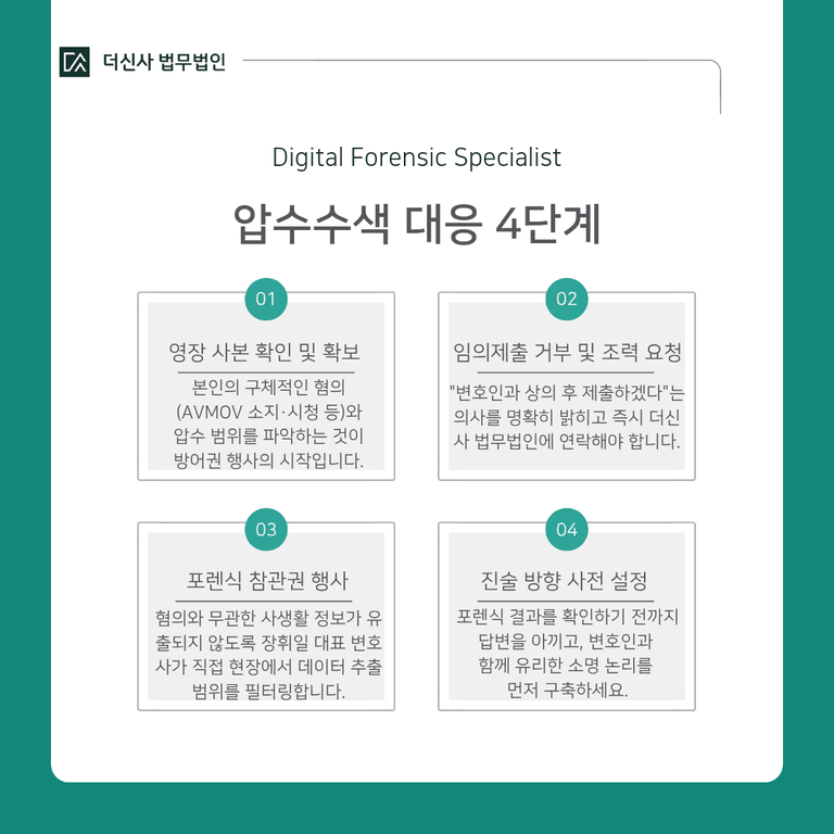 변호인이 포렌식에 참관하지 않으면, 수사기관은 혐의와 상관없는 수년 전의 데이터나 개인적인 프라이버시까지 모두 열람할 가능성이 큽니다. 더신사 법무법인은 포렌식 현장에서 수사관이 AVMOV 관련 키워드 외에 불필요한 자료를 추출하지 못하도록 강력하게 제한하며 의뢰인의 사생활을 보호합니다.