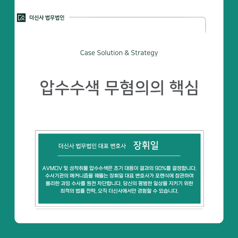 AVMOV 사건은 초기 대응이 늦어질수록 방어의 문턱이 급격히 높아집니다. 지금 이 순간, 압수수색이라는 거대한 위기 앞에 서 계신다면 주저하지 마십시오. 더신사 법무법인과 장휘일 대표 변호사가 여러분의 평범한 일상을 되찾아드리는 가장 든든한 파트너가 되겠습니다.