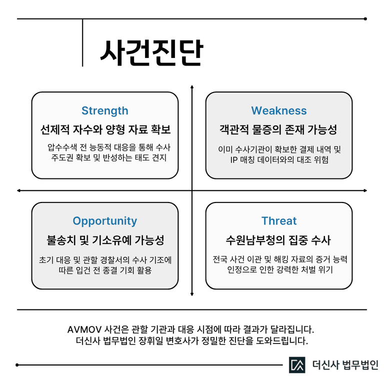 최근 온라인상에서 큰 파장을 일으키고 있는 AVMOV 사건과 관련하여, 수사기관의 본격적인 움직임이 포착되면서 자수를 고민하며 상담을 요청하시는 분들이 급증하고 있습니다. 현재 저희 법인이 파악한 바로는 자수 의사를 타진 중인 사례만 해도 전국적으로 수백 건을 상회할 만큼 사안이 엄중합니다.