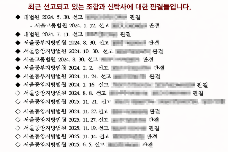 판결 내용: 법원은 안심보장증서가 총회 의결 없이 발행된 점 등을 근거로 해당 계약을 '기망에 의한 계약' 또는 '무효'로 판단했습니다. 이에 따라 조합원은 납입한 금액 전액을 반환받을 수 있는 법적 근거가 확실해졌습니다.