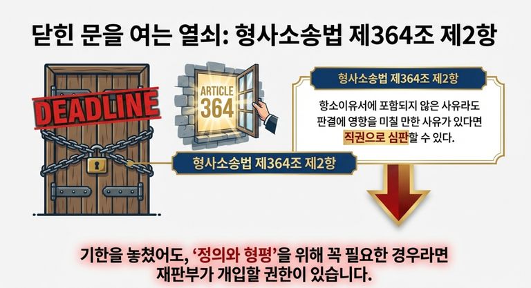 저는 기록을 검토한 즉시, 이미 도과한 기한에 매몰되기보다 재판부의 '직권 판단'을 끌어내는 전략을 세웠습니다. 형사소송법 제364조 제2항에 따르면, 항소이유서에 포함되지 않은 사유라도 판결에 영향을 미칠 만한 사유가 있다면 재판부가 직권으로 심판할 수 있기 때문입니다.