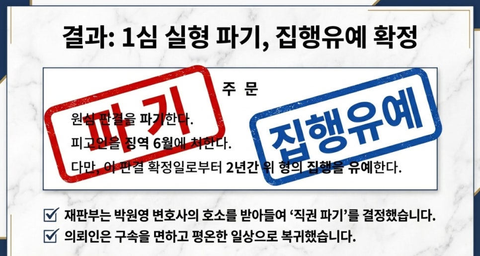 재판부는 박원영 변호사의 호소를 받아들였습니다. 비록 항소이유서 제출은 늦었으나, 피해 변제가 완료된 점 등을 고려하여 직권으로 원심 판결을 파기하고 의뢰인에게 집행유예를 선고하였습니다. 이 판결은 그대로 확정되어 의뢰인은 평온한 일상으로 돌아갈 수 있었습니다.