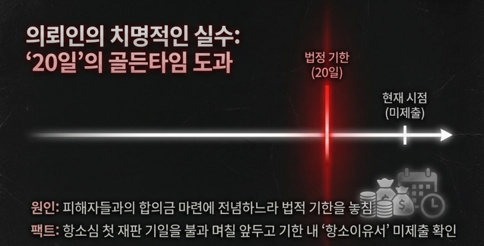하지만 의뢰인은 항소장만 제출한 상태에서 피해자들과의 합의금 마련에만 전념하다 그만 '항소이유서 제출 기한'을 넘기고 말았습니다. 항소심 첫 재판 기일을 불과 며칠 앞두고 다급하게 저 박원영 변호사를 찾아오셨을 때, 사건은 법적으로 매우 불리한 상태였습니다.