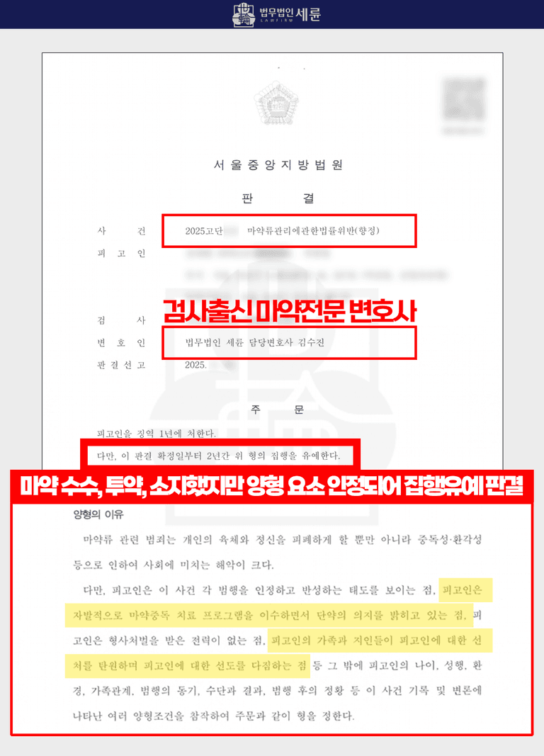 이 사건은 마약을 수수하고 투약하고 소지까지 했던, 어떻게 보면 안 좋은 범죄는 모두 가지고 있었던 사건이었음에도 불구하고, 판사님께서는 피고인이 진심으로 반성하고 더 이상 마약을 하지 않겠다고 의지를 밝히고 있다는 점을 인정했습니다.