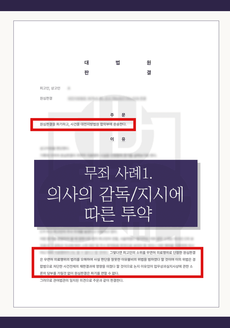 반면, 의사면허가 없는 사람이 주사를 투약하였지만, 의사의 보조자로서 그 감독과 지시에 따라 주사와 투약을 한 것으로 보아 무면허 의료행위로 볼수 없다고 하여 무죄를 선고하였습니다.