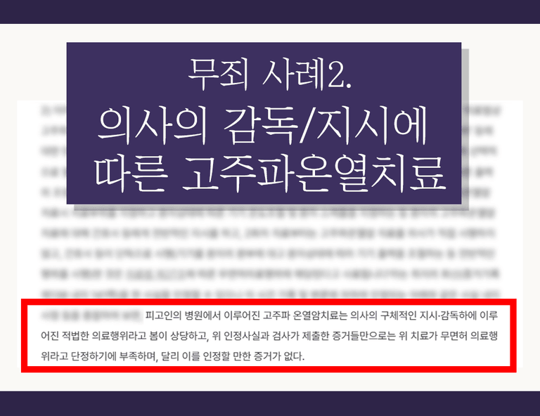 이와 유사한 다른 판례에서도 간호사가 환자에게 고주파온열암치료하였는데, 의사가 치료 여부와 적용부위, 강도를 결정하여 구체적으로 지시하였기 때문에 무면허 의료행위로 단정하기 어렵다는 판례가 있습니다.