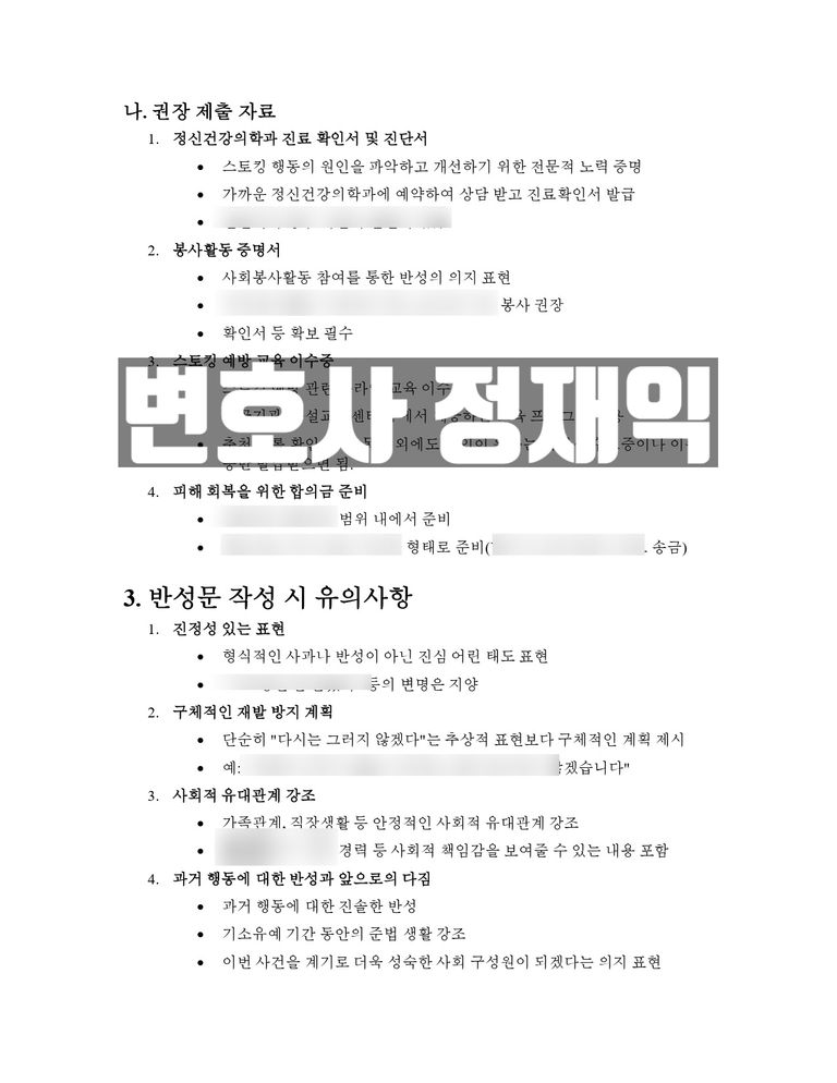 · 스토킹 행위 재발 방지를 위한 구체적 노력을 명시한 재범방지 서약서 작성 및 첨삭