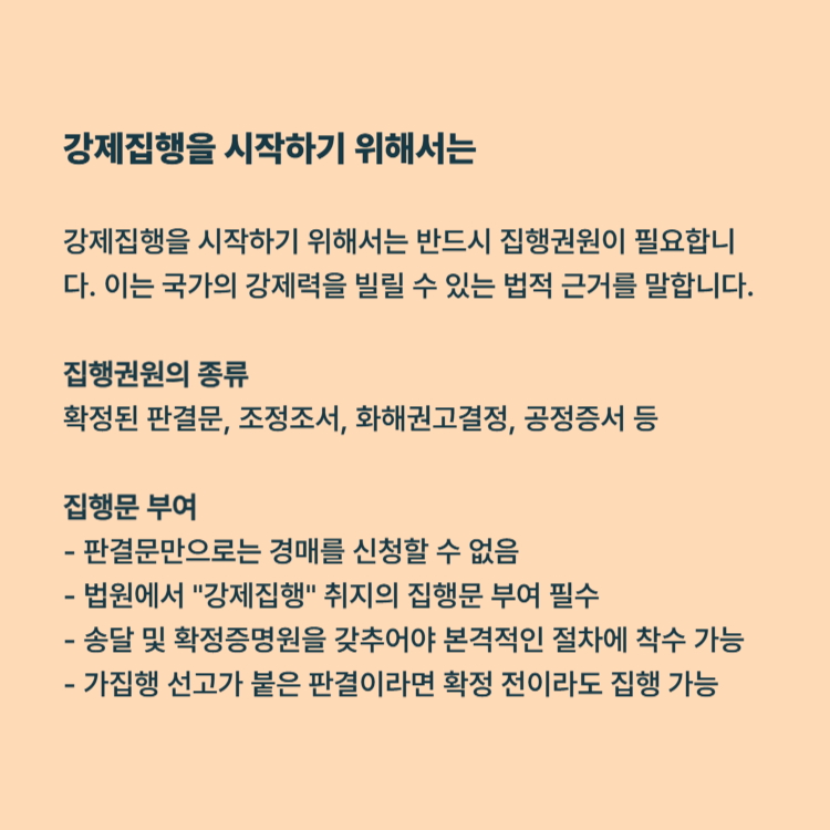 강제집행을 시작하기 위해서는 반드시 집행권원이 필요합니다. 이는 국가의 강제력을 빌릴 수 있는 법적 근거를 말합니다.