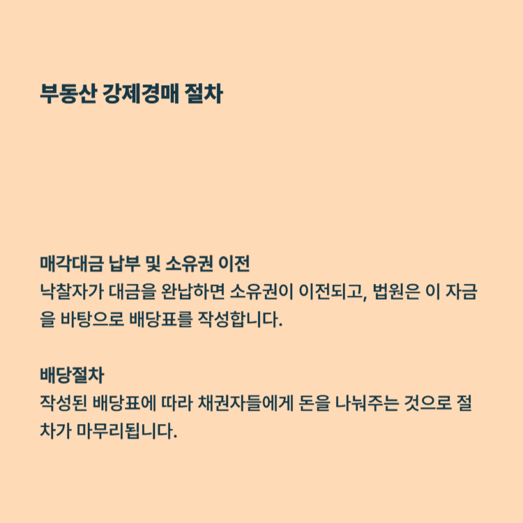 배당절차: 작성된 배당표에 따라 채권자들에게 돈을 나눠주는 것으로 절차가 마무리됩니다.