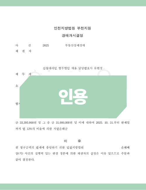 경매가 1회 유찰된 시점에서 B씨는 아파트가 시세보다 훨씬 낮은 가격에 낙찰될 것을 우려해 직접 새움 측에 연락해왔고, 결국 판결금 전액과 지연 이자를 합쳐 현금으로 상환받으며 경매를 취하해주었습니다.