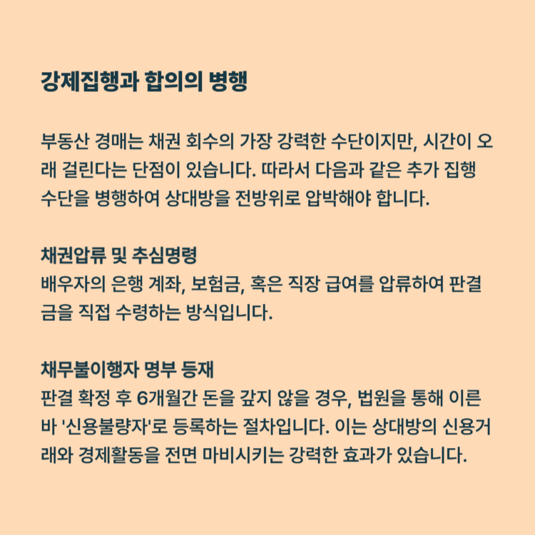 부동산 경매는 채권 회수의 가장 강력한 수단이지만, 시간이 오래 걸린다는 단점이 있습니다. 따라서 다음과 같은 추가 집행 수단을 병행하여 상대방을 전방위로 압박해야 합니다.