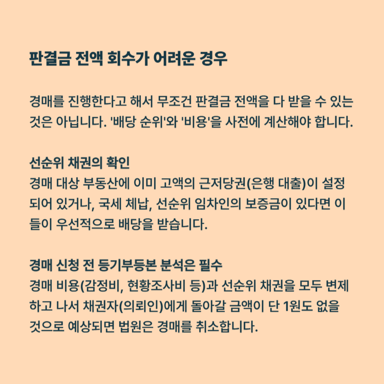 부동산 경매를 진행한다고 해서 무조건 판결금 전액을 다 받을 수 있는 것은 아닙니다. '배당 순위'와 '비용'을 사전에 치밀하게 계산해야 합니다.