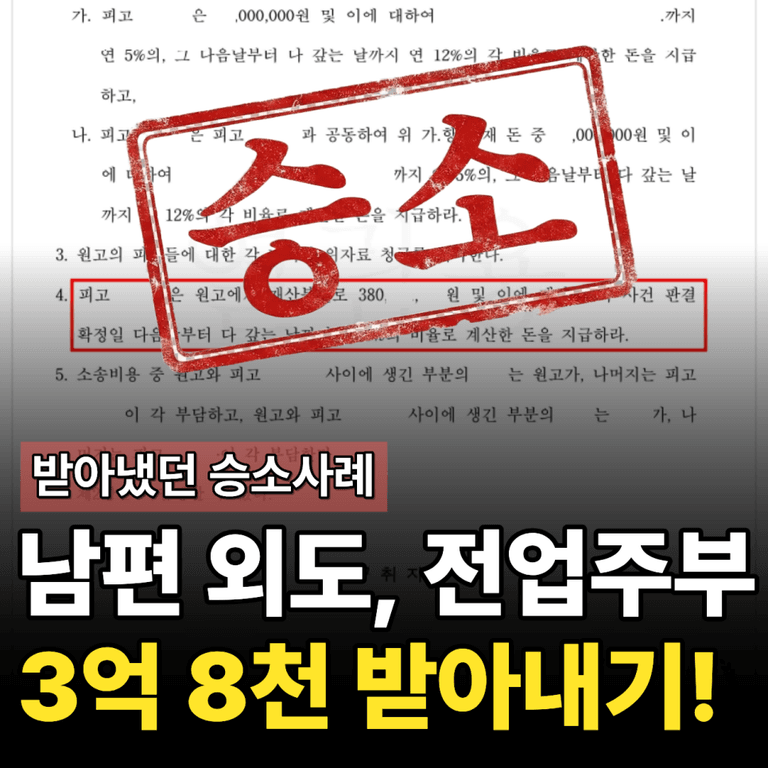 남편 외도 재산분할, 제대로 설계하면 이 사건처럼 전업주부도 3억 8,000만원 받아낼 수 있습니다.