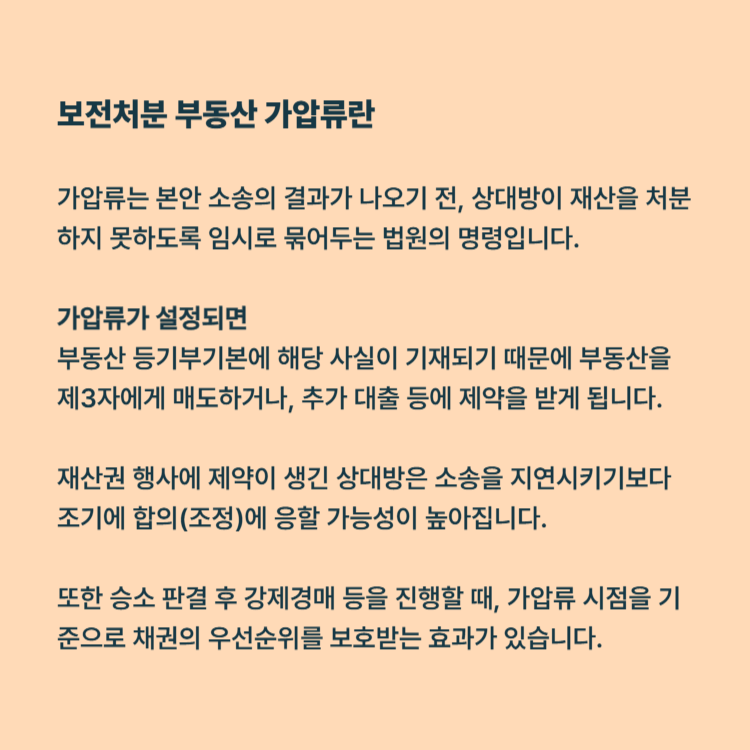 심리적 압박: 재산권 행사에 제약이 생긴 상대방은 소송을 지연시키기보다 조기에 합의(조정)에 응할 가능성이 높아집니다.