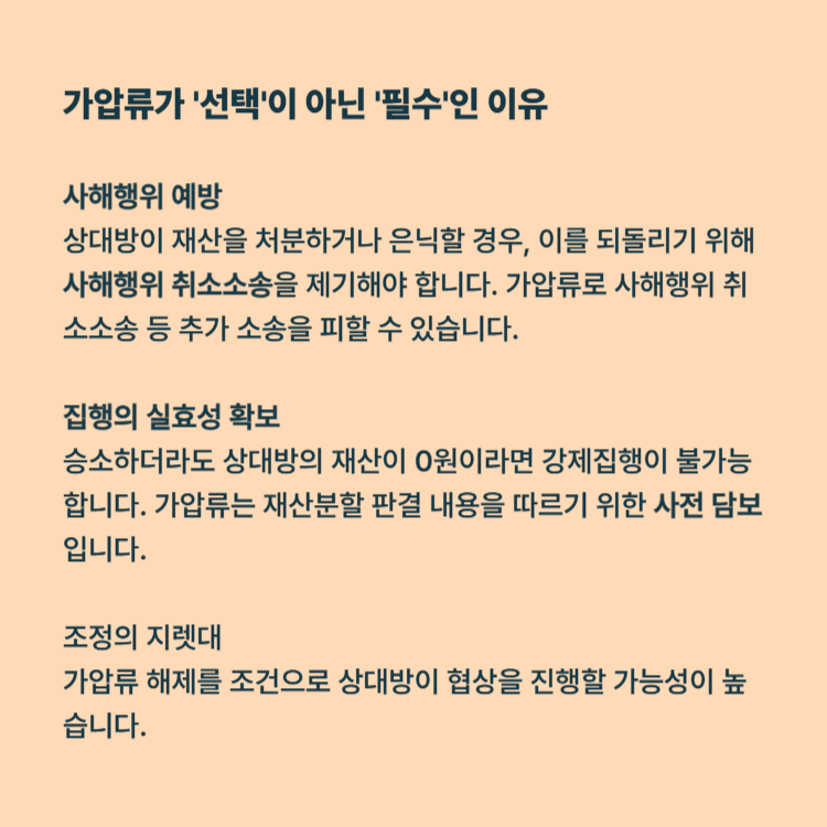 집행의 실효성 확보: 소송에서 10억 원을 분할받으라는 판결을 받아도, 상대방 명의의 재산이 0원이라면 강제집행이 불가능합니다. 가압류는 판결문의 내용을 실제 현금화하기 위한 '사전 담보'입니다.