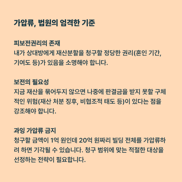 과잉 가압류 금지: 청구할 금액이 1억 원인데 20억 원짜리 빌딩 전체를 가압류하려 하면 기각될 수 있습니다. 청구 범위에 맞는 적절한 대상을 선정하는 전략이 필요합니다.