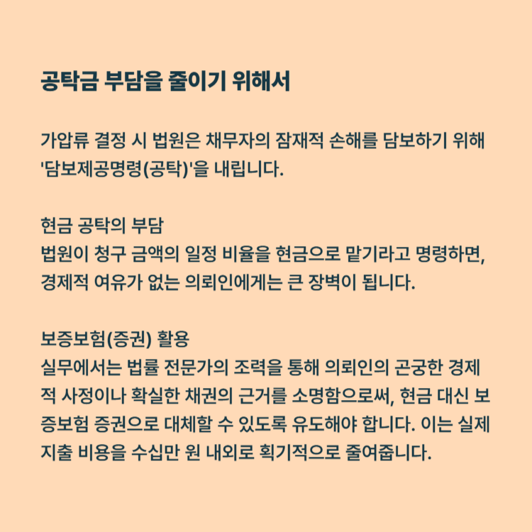 보증보험(증권) 활용: 실무에서는 법률 전문가의 조력을 통해 의뢰인의 곤궁한 경제적 사정이나 확실한 채권의 근거를 소명함으로써, 현금 대신 보증보험 증권으로 대체할 수 있도록 유도해야 합니다. 이는 실제 지출 비용을 수십만 원 내외로 획기적으로 줄여줍니다.