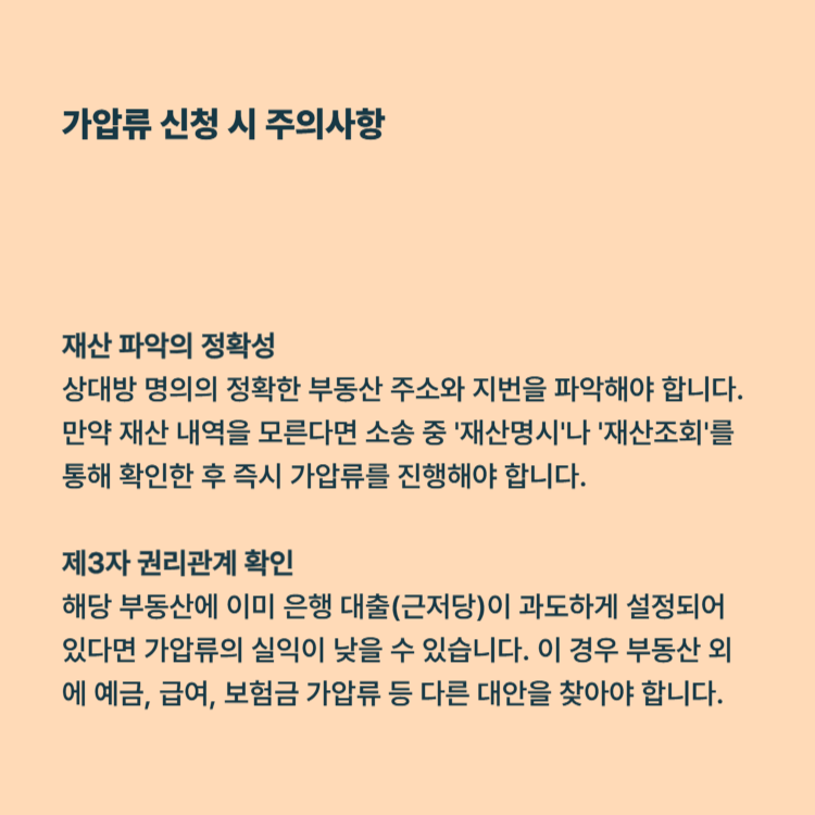 재산 파악의 정확성: 상대방 명의의 정확한 부동산 주소와 지번을 파악해야 합니다. 만약 재산 내역을 모른다면 소송 중 '재산명시'나 '재산조회'를 통해 확인한 후 즉시 가압류를 진행해야 합니다.