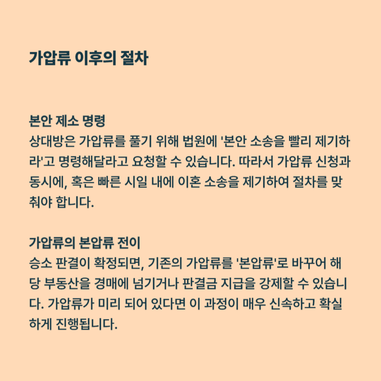 본안 제소 명령: 상대방은 가압류를 풀기 위해 법원에 '본안 소송을 빨리 제기하라'고 명령해달라고 요청할 수 있습니다. 따라서 가압류 신청과 동시에, 혹은 빠른 시일 내에 이혼 소송을 제기하여 절차를 맞춰야 합니다.