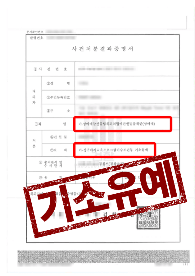 치밀한 준비 끝에 검찰은 변호인 의견을 적극 수용하여 의뢰인에게 존스쿨(성구매자 재범방지 교육) 이수 조건부 기소유예 처분을 내렸습니다. 이로써 의뢰인은 단 한 차례의 전과 기록(소위 빨간 줄)도 남기지 않고 사건을 완벽하게 종결할 수 있었습니다. 벌금형만 선고받았어도 성범죄 전과자가 되어 사회생활에 큰 제약이 생길 뻔했던 위기를 전문가의 신속한 도움으로 현명하게 극복해 낸 사례입니다.