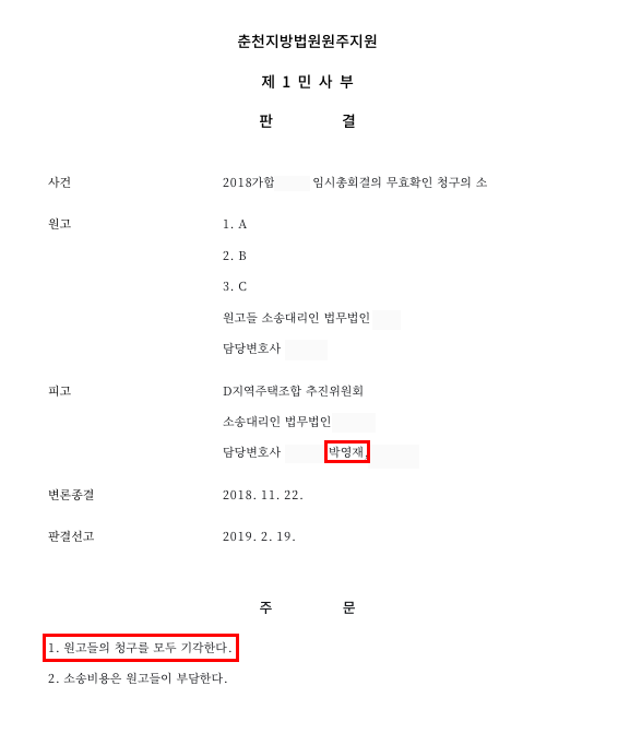 변호인의 조력 : 본 변호사는 총회 소집 당시의 구체적 사정과 구성원 현황, 통지 방식의 현실적 한계를 상세히 정리하여 법원에 설명하였습니다. 또한 원고 주장과 달리 총회 소집이 특정 구성원의 권리를 침해하거나 형식적 요건을 중대하게 위반한 것이 아니라는 점을 논리적으로 주장하였고, 관련 자료를 통해 절차의 합리성과 정당성을 적극 소명하였습니다.