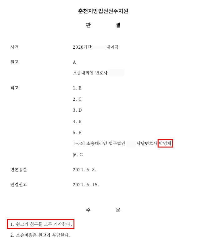 판결 : 법원은 원고의 주장을 받아들이지 않고 대여금 청구를 전부 기각하였습니다. 그 결과 의뢰인들(피고들)은 금전 반환의무를 부담하지 않게 되었고, 실질적으로 전부 승소 판결을 받았습니다.
