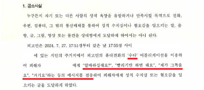 A씨는 2024. 7. 27. 17:51경 랜덤 채팅 어플리케이션 '수다'에서 매칭이 되어 처음 알게 된 B씨에게 "알바하실래요?", "빨리기만 하면 돼요", "제가 그쪽을요", "거기요"라는 등의 채팅을 전송하였습니다.