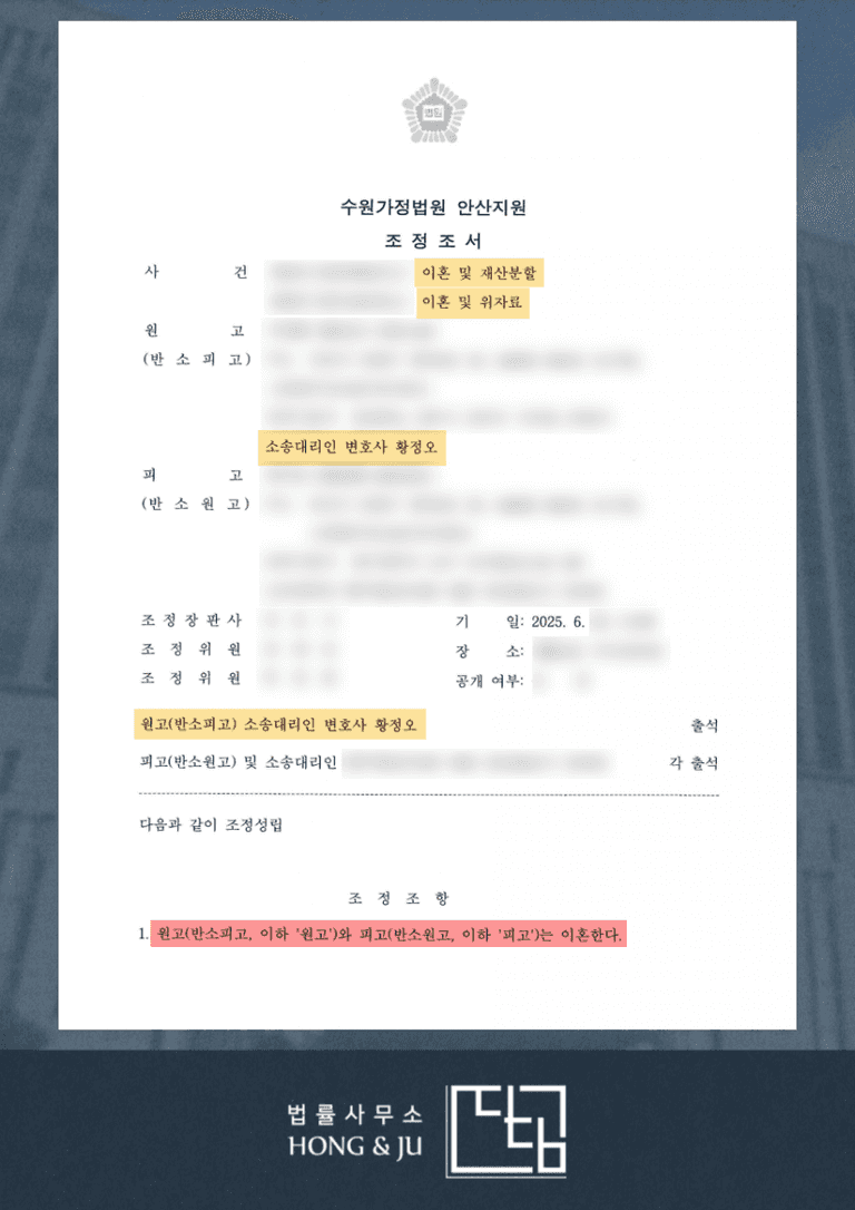 혼인 기간이 짧고, 쌍방의 감정적 대립이 심화될 가능성이 있었던 상황에서 안산이혼전문변호사는 의뢰인의 의사를 최대한 반영하며 조정 중심의 실용적 전략으로 대응, 결국 의뢰인의 원하시던 대로 이혼 사건은 조속히 마무리 됐습니다.