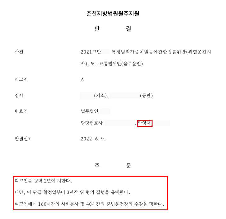 판결 : 그 결과 법원은 의뢰인(피고인)에게 징역 2년을 선고하면서도 형의 집행을 3년간 유예하고, 사회봉사명령과 준법운전강의 수강명령을 부과하는 선에서 사건을 마무리하였습니다. 실형을 면하고 사회 내에서 갱생의 기회를 확보한 점에서 변호인의 조력이 실질적인 결과를 이끌어낸 사례라 할 수 있습니다.