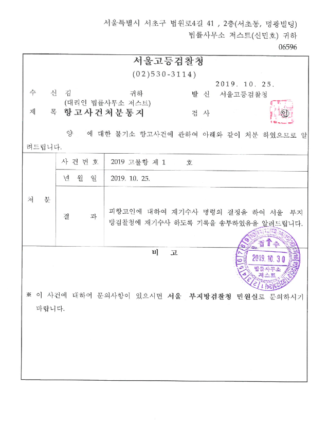 이번 사건도 검사가 피의자의 말만 믿고 불기소처분을 하였으나, 의뢰인이 포기하지 않고 항고한 끝에 고등검찰청에서 재기수사명령을 받았습니다.