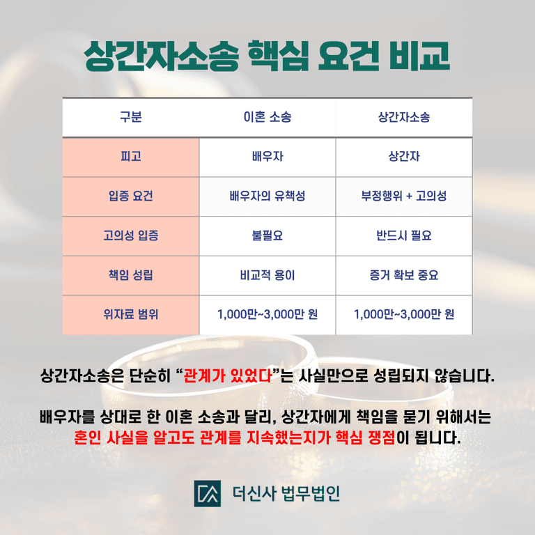 배우자를 상대로 한 이혼 청구에서는 유책성만 입증하면 되지만, 상간자소송에서는 상대방이 혼인 사실을 알고도 관계를 지속했는지, 즉 고의성이 있었는지를 함께 증명해야 합니다.