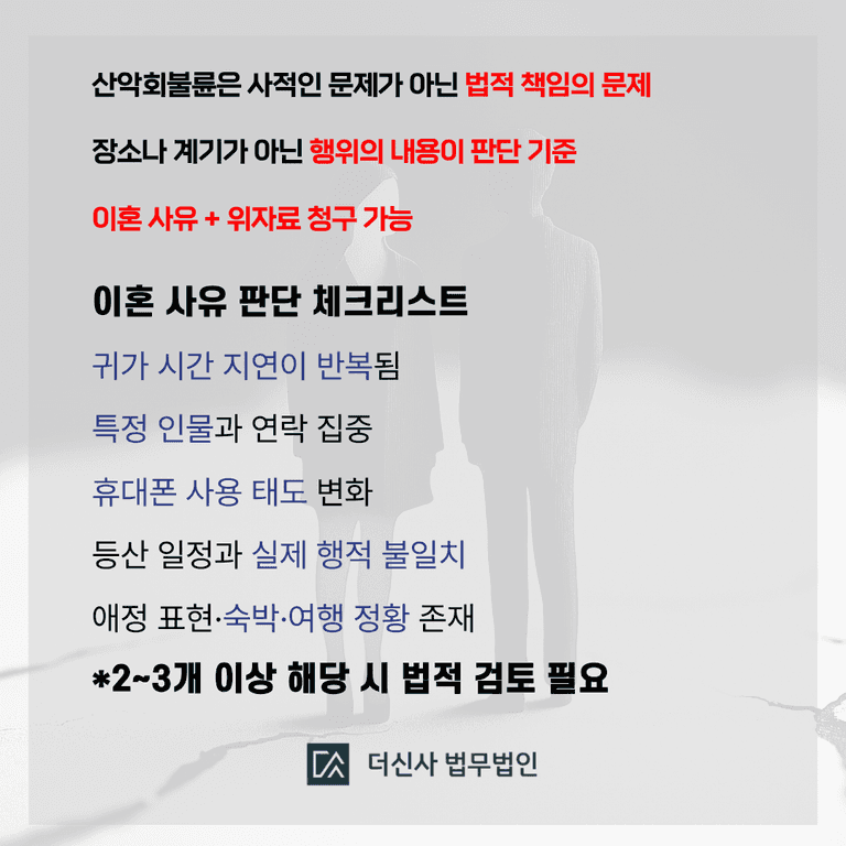 오늘은 실제 상담에서도 자주 다뤄지는 산악회불륜이혼과 관련한 법적 쟁점을 정리해보겠습니다.