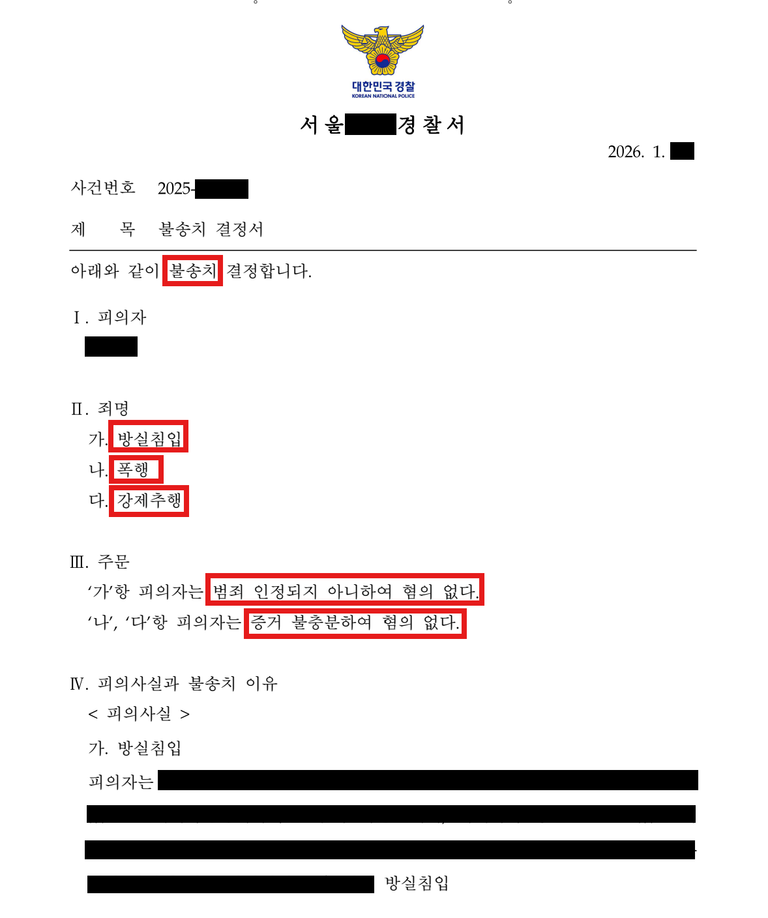 고소된 모든 혐의에 대해 불송치 결정이 내려졌고, 사건은 형사절차로 더 이상 진행되지 않았습니다.