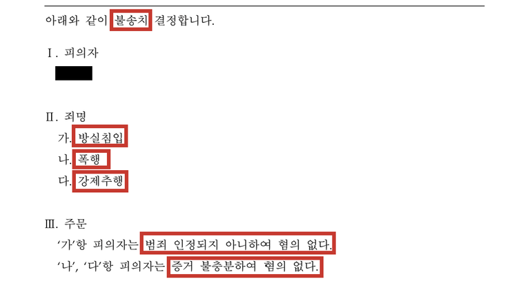 방실침입 혐의는 범죄가 성립하지 않는다고 보아 혐의없음,