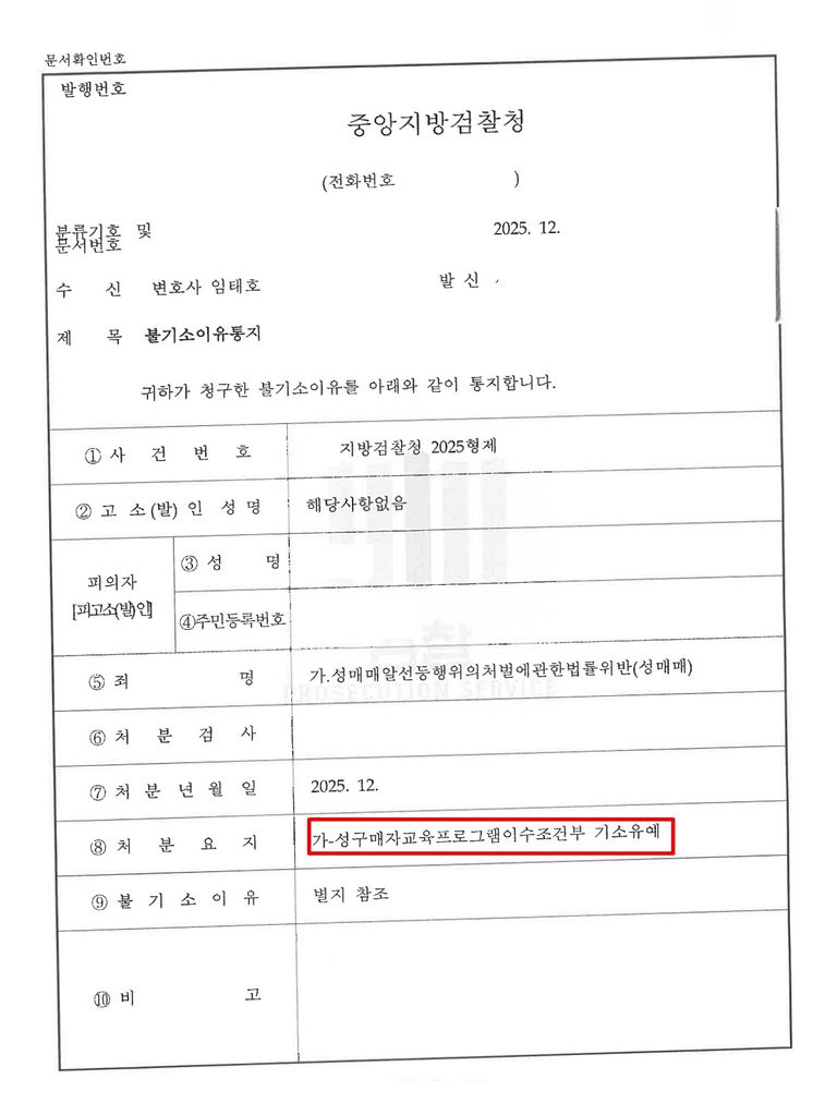 5. 그 결과, 검찰은 A씨의 전력, 사건 경위, 반성 태도 등을 종합적으로 고려하여 성구매자 교육 프로그램 이수를 조건으로 한 교육조건부 기소유예 처분을 결정하였고, A씨는 별도의 형사처벌 없이 사건을 마무리할 수 있었습니다.