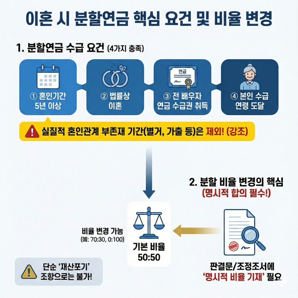 분할연금을 포기하거나 비율을 달리 정하고 싶다면, 반드시 재판서(판결문, 조정조서)나 공증된 합의서에 "연금 분할 비율을 O:O으로 한다" 또는 "분할연금 청구권을 포기한다"고 명시적으로 기재해야 합니다.