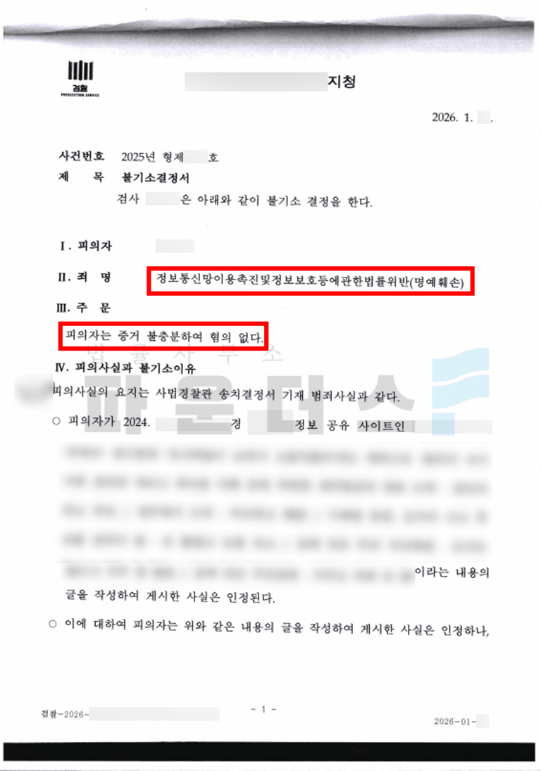 이에 따라 본 사건은 정보통신망법상 명예훼손 혐의에 대해 혐의없음 처분으로 종결되었습니다.
