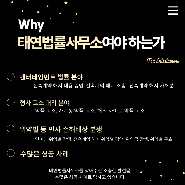 '엔터테인먼트 전문 변호사' 뿐만 아니라 '형사 전문 변호사' 타이틀을 가지신 전문성을 토대로 '인기 유튜버, BJ, 아이돌, 가수, 배우 등 많은 연예인과 인플루언서, 개인방송인' 등 유명인 분들 뿐만 아니라 일반인 분들의 인터넷 명예훼손죄 사건을 해결하고 계십니다.