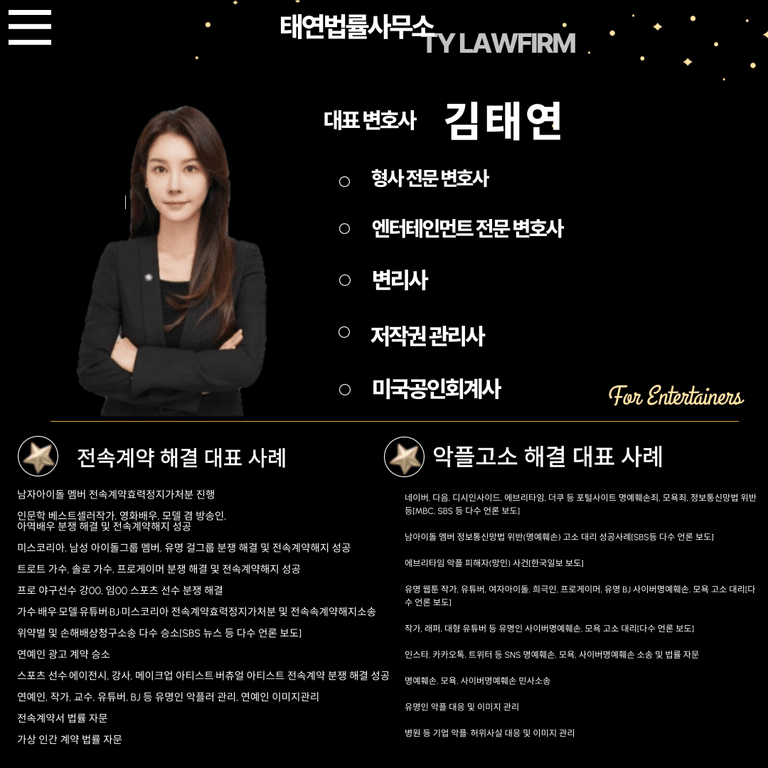 많은 스타 연예인, 프로 운동 선수, 유튜버, 베스트셀러 작가 등 유명인분들께서 태연법률사무소를 찾아주시고 계십니다. 그 이유는 바로 수많은 사건을 해결해오며 쌓은 태연법률사무소만의 전문성 때문인데요. 즉, 태연법률사무소는 해외에 본사를 둔 사이트에 작성된 악플이나 가계정 악플도 고소할 수 있는 태연법률사무소만의 노하우를 갖고 있습니다.