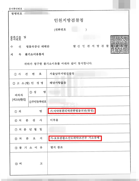 검찰은 투약량이 적지 않음에도 불구하고 변호인의 주장을 받아들였습니다. 의뢰인이 초범이고 범행을 모두 자백한 점, 그리고 '사법치료-재활 연계 모델' 참여를 통해 재범을 방지하고 사회 구성원으로 복귀하는 것이 타당하다고 판단하여 교육조건부 기소유예 처분을 내렸습니다.