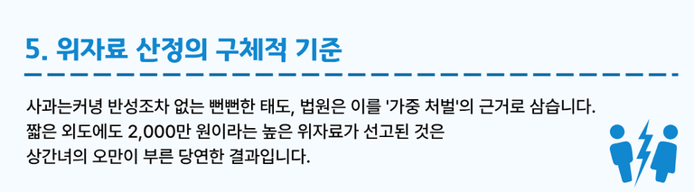 법원은 위자료 액수를 정할 때 혼인기간, 외도 경위, 반성 여부, 피해자의 고통 정도를 종합적으로 고려합니다.