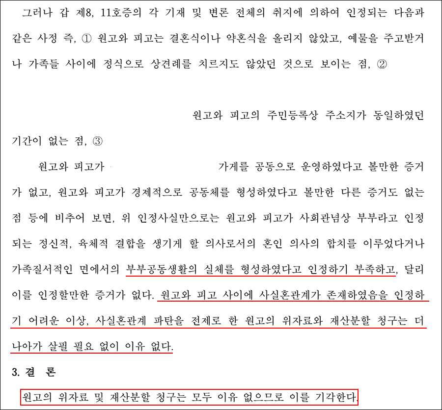 이에 따라 사실혼 관계 자체가 성립하지 않는다고 명확히 판시하였고, 사실혼을 전제로 한 재산분할 청구와 위자료 청구 역시 모두 이유 없다고 보아 전부 기각하였습니다.