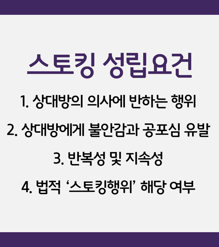 우선 스토킹처벌법상 스토킹 행위가 성립하려면 다음 요건이 충족되어야 합니다.